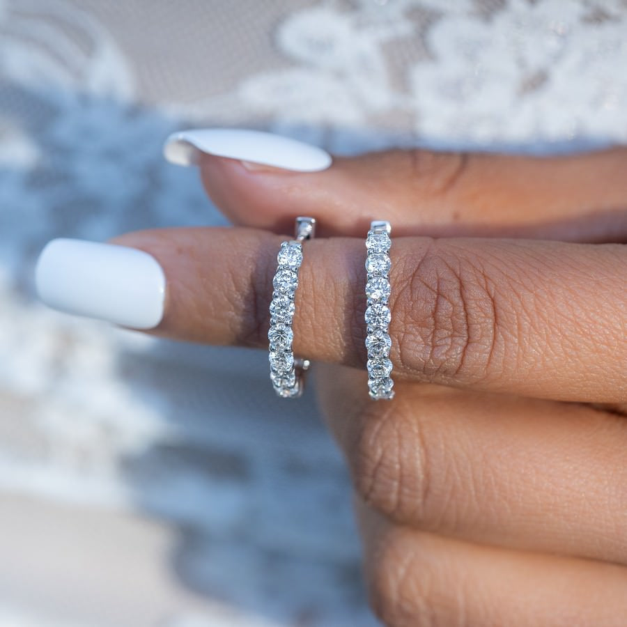Subtle sparkle, unmistakable style. These 14K white gold huggee earrings feature 2.5 carats total weight of radiant lab-created diamonds, offering the perfect balance of elegance and edge. Set in a refined 15mm design, the F-G color and SI clarity stones catch the light beautifully with every move. Ideal for everyday luxury or an elevated evening look, they’re a timeless addition to any jewelry collection.
